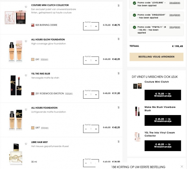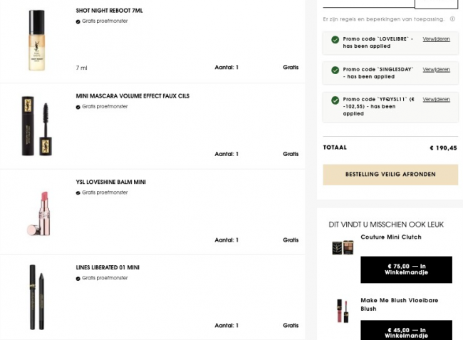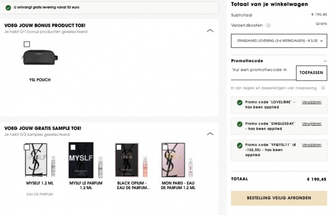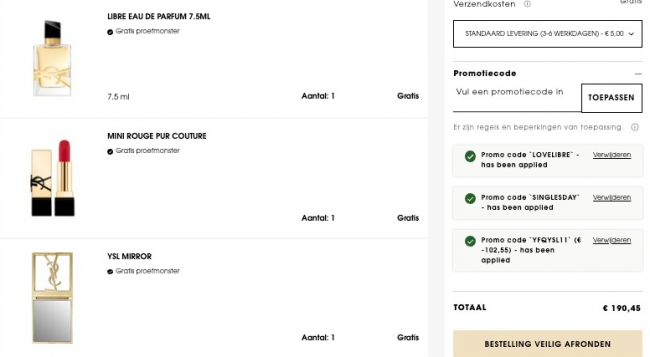 2.输入独家折扣码:YFQYSL11,折后满70€赠3件码:SINGLESDAY,买自由之水系列送香水盒子码:LOVELIBRE